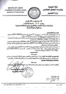 اصدر وزير التعليم بحكومة الوفاق الوطني قرار رقم (166) لسنة 2018 بشأن إعفاء أبناء الشهداء والمفقودين وذوي الإعاقة المستديمة من مصابي حرب التحرير من دفع الرسوم المالية بالمؤسسات التعليمية طيلة فترة دراستهم وبكافة مستوياتهم.