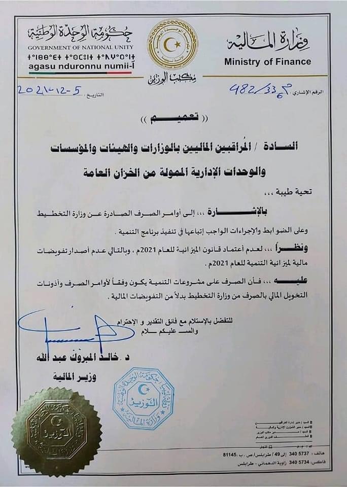 أصدر وزير المالية تعميم موجه إلى المراقبين الماليين بالوزارات والهيئات والمؤسسات والوحدات الإدارية الممولة من الخزانة العامة ، مع إشارته إلى آوامر الصرف الصادرة عن وزارة التخطيط وعلى الضوابط والإجراءات الواجب إتباعها في تنفيذ برنامج التنمية .
