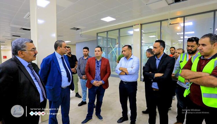 توجه وزير المواصلات بحكومة الوحدة الوطنية ” محمد الشهوبي” رفقة رئيس مصلحة المطارات وبعض مدراء الإدارات الفنية ورؤساء الأقسام المختصة بالمصلحة بزيارة تفقدية داخل صالة المغادرة الدولية الجديدة الجاري العمل على إنشاؤها بمطار معيتيقة الدولي.
