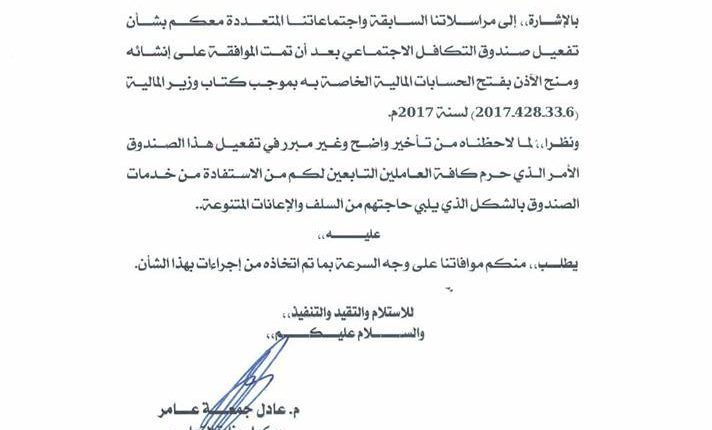 لافتاً إلى أن ما تم ملاحظته من تأخير واضح وغير مبرر في تفعيل الصندوق الأمر الذي حرم كافة العاملين التابعين لهم من الاستفادة من خدمات الصندوق بالشكل الذي يلبي حاجتهم من السلف والإعانات المتنوعة، منوهاً إلى المراسلات السابقة التي تمت في هذا الشأن.