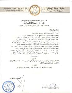 في 5 من شهر مايو 2017 أقر المجلس الرئاسي لحكومة الوفاق الوطني الميزانية الترتيبات المالية للعام 2017 بقيمة 37،560،000.000 مليار دينار خصصت 20،470،000.000 مليار دينار كمخصصات للمرتبات بالدولة، كما خصصت لاحتياجات المواطنين الغذائية والدوائية والنظافة والكهرباء والحروقات مبلغا وقدره 6،370،000.000 مليار دينار.