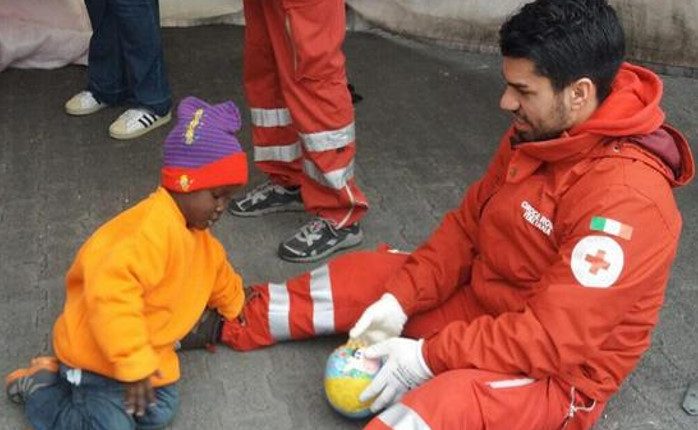 حيث التقطت هذه الصورة من ملف تعريف الصليب الأحمر على تويتر، ويظهر فيه احد أفراد الصليب الاحمر مع أحد الاطفال المهاجرين في ميناء كاتانيا ، أثناء النزول من السفينة حيث  نجا ثمانية عشر من سفينة خفر السواحل من بين 86 شخصا ، يوم السبت الماضي والتى ابحرت حوالي أربعين ميلا شمال طرابلس.