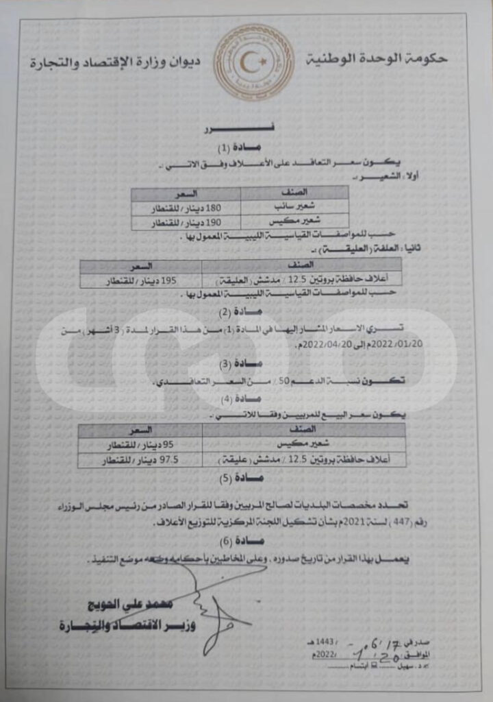 حيث حدد بموجبه نسبة %50كدعم من الحكومة لأسعار الأعلاف الحيوانية، وذلك تنفيذاً لقرار حكومة الوحدة الوطنية رقم (569) لسنة 2021م بشأن تخصيص مبلغ وقدره سبعمائة وخمسة مليون دينار لصالح الشركة الوطنية للمطاحن والأعلاف المساهمة بهدف توريد أعلاف حيوانية لدعم المربين والمحافظة على الثروة الحيوانية .