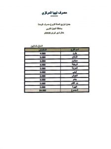 ونشر المصرف المركزي جدول توزيع العملة على فروع المصارف التجارية بمدن الجبل الغربي خلال هذا الشهر، حيث بلغت حصة فروع مصرف الجمهورية 80 مليون دينار، وفروع مصرف التجاري الوطني 30 مليونا، فيما بلغت قيمة السيولة الموزعة لفروع مصرفيْ الوحدة وشمال أفريقيا 28 مليون دينار لكل منهما، في حين كان نصيب فرع مصرف الصحاري بالمنطقة أربعة ملايين دينار.
