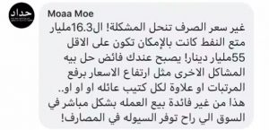 كما طالب احدهم بتغيير سعر الصرف لوضع حل لمشكلة السيولة وارتفاع الاسعار