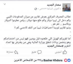 ناشد الباحث الاقتصادي مختار الجديد عبر صفحته الشخصية مصرف ليبيا المركزي عرض تقرير حقيقي عن ميزان المدفوعات الليبي وكذلك الإجابة عن التساؤلات التي تدور بأذهان الكثيرين ومنها كم هي قيمة عائدات ليبيا بالدولار ؟وكم قيمة ماصرف منها؟ وما أوجه صرفها؟ ولمن تم منح الاعتمادات ؟ كما طالب بعرض قائمة بأسماء الجهات والشركات المستفيدة بذلك؟و كذلك طالب بعرض احتياطات ليبيا من النقد الأجنبي..