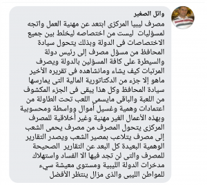 وقد أشار ان تقرير ليبيا المركزي الذي عرض الأسبوع الماضي هو من اختصاص وزارة المالية وليس اختصاص ليبيا المركزي والوزارة هي من المفترض أن تقوم بإعداد التقرير وذلك لاشتماله بيانات المبالغ التقديرية سواء للايرادات أو المصروفات ومقارنتها بالمبالغ الفعلية وهو أمر يفترض أن يناط بوزارة المالية وليس المصرف المركزي ..